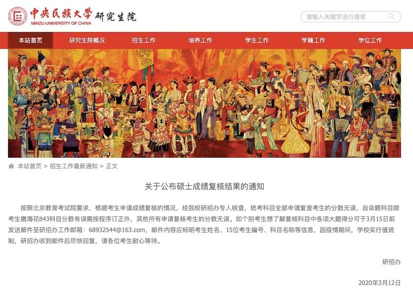 按照北京教育考试院要求,根据考生申请成绩复核的情况,经我校研招办专人核查,统考科目全部申请复查考生的分数无误,自命题科目除考生撒海花843科目分数有误需按程序订正外,其他所有申请复核考生的分数无误。如个别考生想了解复核科目中各项大题得分可于3月15日前发送邮件至研招办工作邮箱:68932544@163.com,邮件内容应标明考生姓名、15位考生编号、科目名称等信息,因疫情期间,学校实行值班制,研招办收到邮件后尽快回复,请各位考生耐心等待。