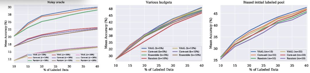 最后,本文给出了 CIFAR100 库中初始标注偏移情况(bias)、预期规模(budget)、噪声 oralce 对 VAAL 的影响,实验结果见图 5,实验证明了 VAAL 对不同参数的鲁棒性。