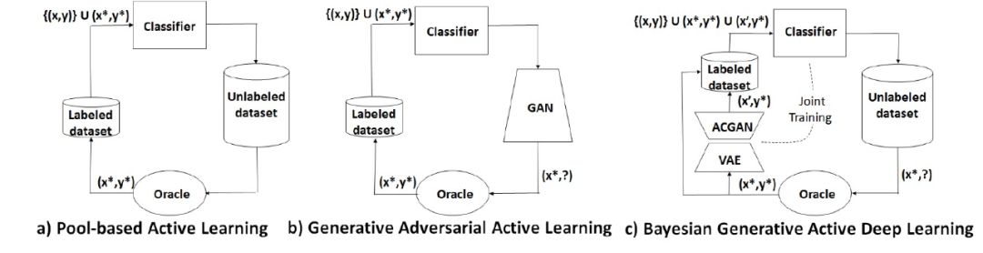 本文的研究主要受到最近提出的一种生成性对抗性主动学习方法(Generative adversarial active learning,GAAL)(Zhu and Bento, 2017 (https://arxiv.org/abs/1702.07956v5)) 启发,不同于传统的根据抽样策略选择信息量最大样本的主动学习方法,GAAL 依靠一个优化问题生成新样本(这种优化平衡了样本信息性和图像生成质量)。本文提出的贝叶斯生成式主动深度学习模型利用传统的基于池的主动学习方法选择样本,之后利用生成性对抗模型生成样本。传统的基于池方法、GAAL 和本文模型的对比图示见图 1。