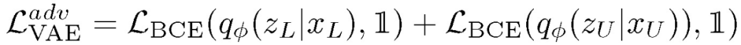 在上一步处理中,VAE 将已标注和未标注的数据映射到具有相似概率分布的同一潜在空间,它愚弄鉴别器将所有输入均定义为已标注的数据。另一方面,鉴别器则试图有效地估计该数据属于未标注数据的概率。关于 VAE 的对抗角色目标函数表述为: