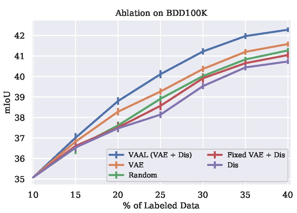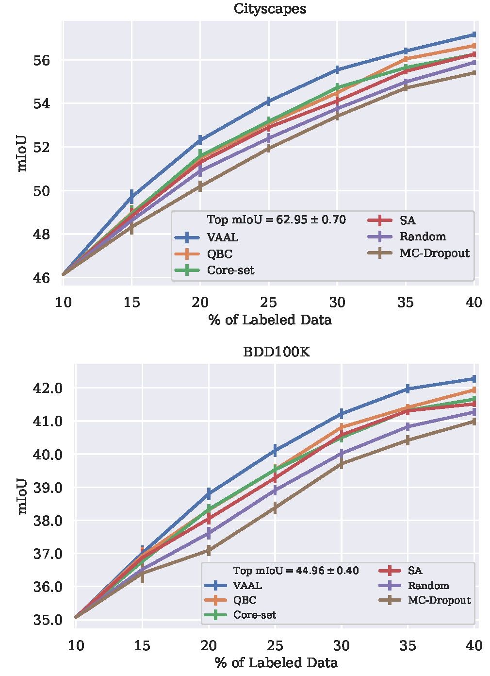 图3:与QBC、Core-set、MC-Dropout和Random Sampling相比,使用Cityscapes和BDD100K的VAAL在分割任务上的性能更好