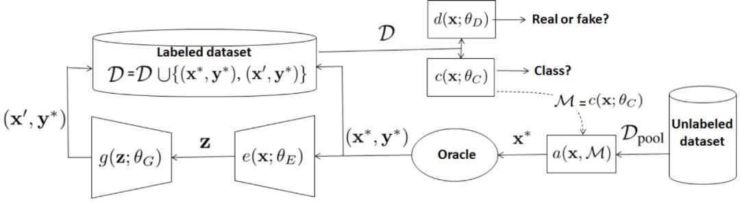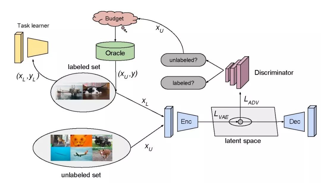 其中,前两篇提出基于池的查询获取方法:《Learning loss for active learning》通过添加损失函数设计一种任务不可知的主动学习方法,《Variational Adversarial Active Learning》设计了一种利用 VAE 和对抗网络来学习潜在空间中已标注数据分布情况的查询策略。第三篇 ICML 的文章《Bayesian Generative Active Deep Learning》介绍了一种利用对抗性网络的查询合成方法。