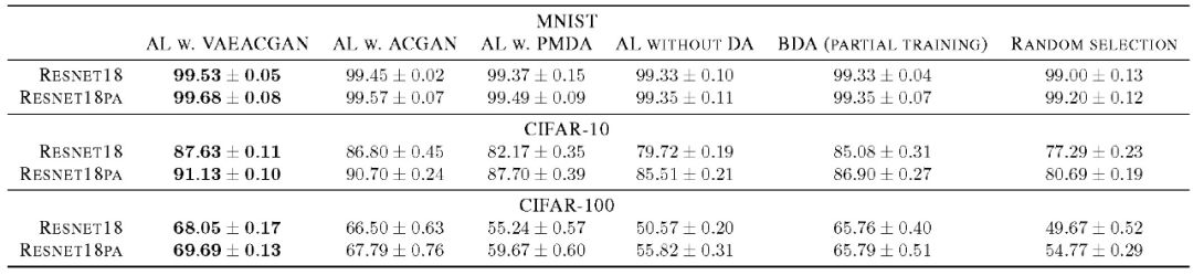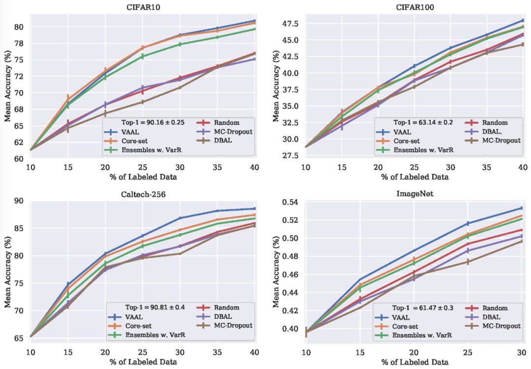 VAAL 的关键是以一种对抗性的方式同时学习 VAE 和对抗性网络,从而找到最有价值的抽样策略(准则)。本文基于各种图像分类和语义分割基准数据集对 VAAL 进行了广泛评估,VAAL 在 CIFAR10/100、CALTECH-256、IMAGENET、CITYSCAPE 和 BDD100K 上均获得了较好的效果。实验结果表明,本文的对抗性方法在大规模数据集中能够学习有效的低维潜在空间,并提供计算有效的抽样策略。