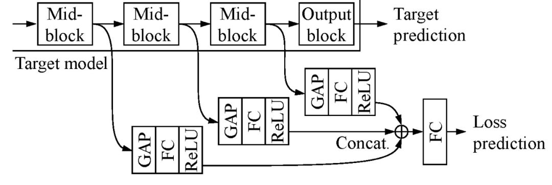 损失预测模块:ResNet-18 由 4 个基本块组成 {convi_1; convi_2 j| i=2; 3; 4; 5},每个模块有两层。将损失预测模块连接到每个基本块,利用块中的 4 个特性来估计损失。