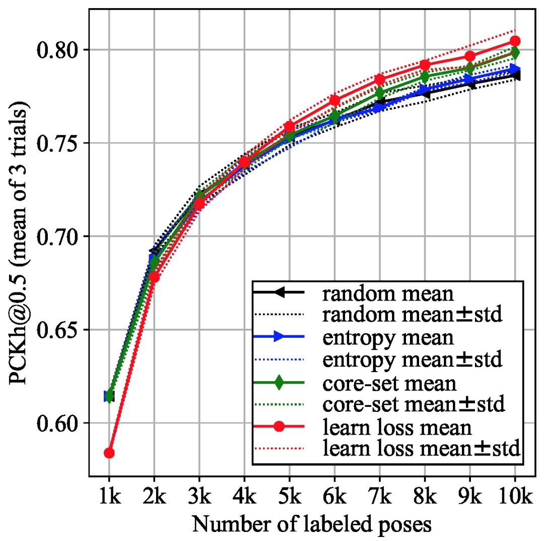 数据库:本文选择 MPII 数据库。由于训练集数据量非常大,本文在每个主动学习循环阶段选择一个随机子集(大小为 5000),从中选取 K 最不确定样本。