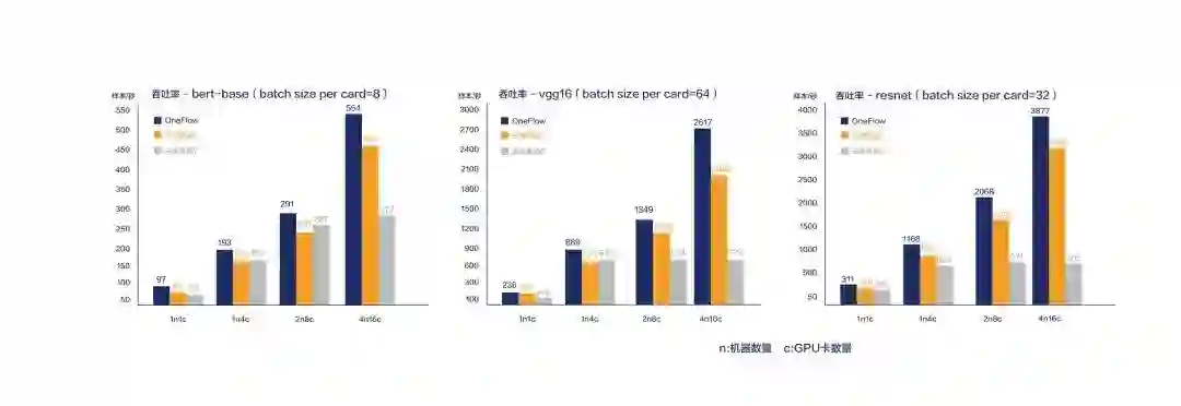 从运行效率角度考察,OneFlow 的优势可以概括为“人有我优”和“人无我有”。对于参数量不大的模型, 现有框架已经支持的比较好,例如对 CNN 和 BERT,OneFlow 仍会有百分之十以上的性能提升 (性能对比情况见下图, 图中 2n8c 表示 2 机 8 卡), 谓之“ 人有我优 ”;而对于超大参数量的大模型, 就需要模型并行或流水并行技术,现有主流深度学习框架并不支持,只有经过深度定制才能满足这种大模型训练的需求,所以称作“人无我有”。经过实测,对于这种超大模型的场景,即使其它框架经过深度定制,可以支持, OneFlow 的运行效率 仍 会有数量级的优势。
