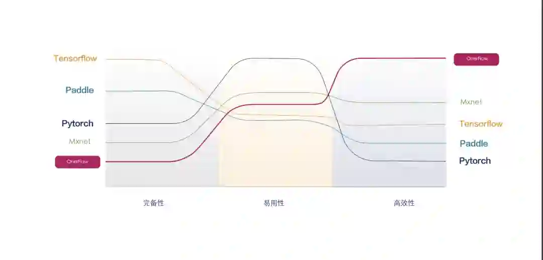 面对完备性、易用性、高效性三座大山,OneFlow 在技术路线上选择高效性进行重点突破。这样的选择,一是基于公司背景 ,在巨头已有先发优势的情况下,跟在对方后面,即使有“微创新”,技术也很容易被对方吸收,不可能脱颖而出 ;二是因为团队认为相比先做完备性和易用性,先做底层技术可能更好。后期对内核的修改,可能带来比较大的改动成本和推广成本。例如,Python2 升级到 Python3,TensorFlow 升级到 TensorFlow2,由于接口 API、运行逻辑等变化,对已经在使用的用户造成了一定的困扰。