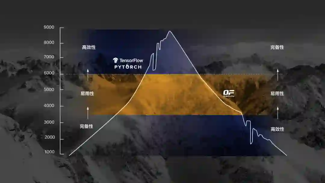以攀登珠穆朗玛峰的两条经典路线来打比方的话,OneFlow 相当于是从珠穆朗玛峰的南坡爬起,首先经历并解决了最困难的问题,刚度过最困难点时的海拔会比 TensorFlow 和 PyTorch 低。TensorFlow 和 PyTorch 已经从北坡爬到了很高的高度,但他们之前的路相对容易,马上要面临最难的问题。袁进辉认为,这种局面下 OneFlow 有机会 最先爬到山顶。解决完备性等问题,再去解决高效性的难度非常大,而先解决高效性的问题会使攀登路途变得容易。
