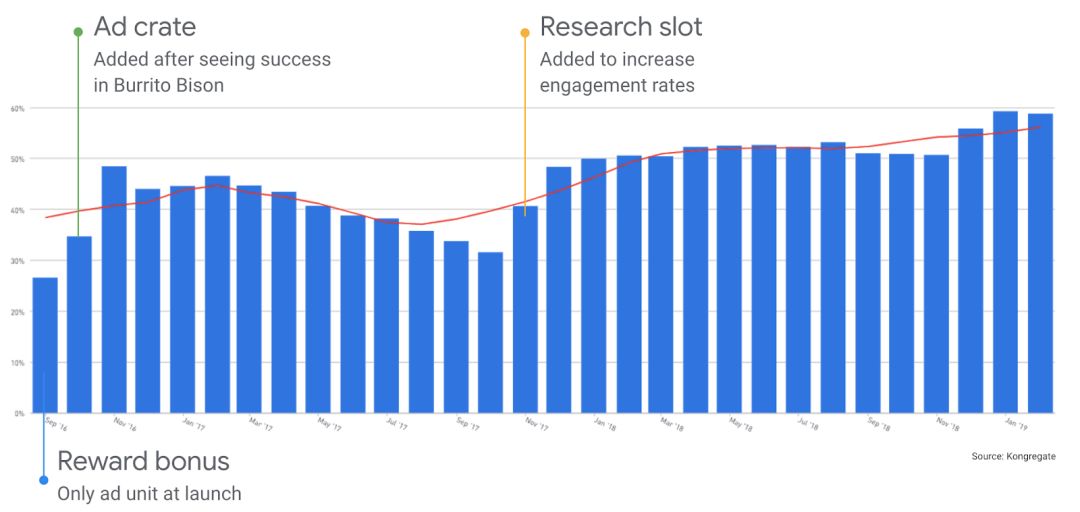 广告研究插槽 (Research slot) 的上线,让用户参与度大大增加,实现了 Kongregate 的目标,即 60%,这个数据足以与许多休闲游戏相媲美。