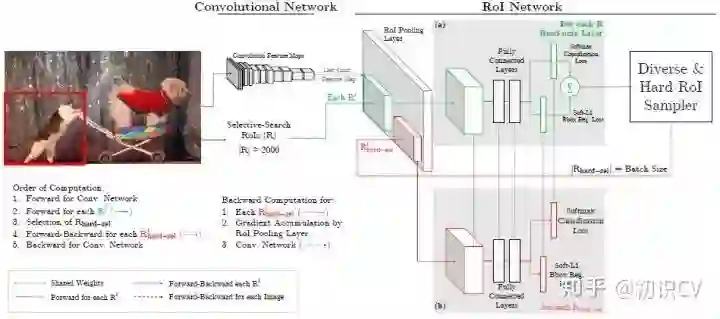 但在OHEM的工作中,作者提出用R-CNN子网络对RoI Proposal预测的分数来决定每个batch选用的样本,这样,输入R-CNN子网络的RoI Proposal总为其表现不好的样本,提高了监督学习的效率。实际操作中,维护两个完全相同的R-CNN子网络,其中一个只进行前向传播来为RoI Proposal的选择提供指导,另一个则为正常的R-CNN,参与损失的计算并更新权重,并且将权重复制到前者以使两个分支权重同步。