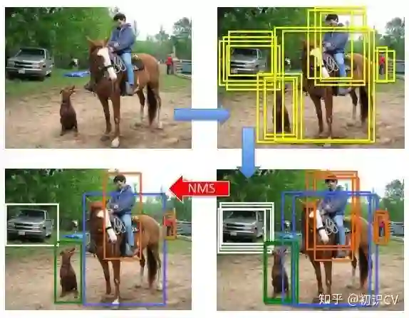 微调法和投票法由工作[4]提出,前者也被称为Iterative Localization。微调法最初是在SS算法得到的Region Proposal基础上用检测头部进行多次迭代得到一系列box,在ResNet的工作中,作者将输入R-CNN子网络的Region Proposal和R-CNN子网络得到的预测框共同进行NMS(见下面小节)后处理,最后,把跟NMS筛选所得预测框的IoU超过一定阈值的预测框进行按其分数加权的平均,得到最后的预测结果。投票法可以理解为以顶尖筛选出一流,再用一流的结果进行加权投票决策。