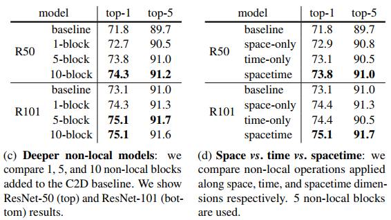 (c)展示了将非局部模块加入 C2D 基线后的结果,实验中用到了50层和101层的ResNet,可以看出,总体而言,增加的非局部模块越多,最后的精度越高。