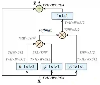 一个时空非局部组件。特征映射被表示为张量,⊗表示矩阵乘法,⊕表示单元和。每一行进行softmax。蓝框表示1×1×1的卷积。图中显示的是嵌入式高斯版本,具有512个通道的瓶颈。