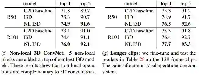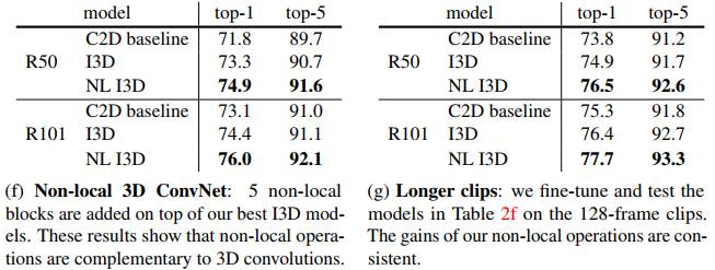 值得注意的是,在视频变长以后,non-local的trick的提升变小了。Reasonable。因为在时间维度上,这些短视频帧数太短,时间维度上的小卷积得到的信息不足,劣势明显。时间变长了,non-local也不能handle这么大的信息量了,损失一些信息的小卷积反而不那么差劲了。