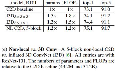(e)对比了非局部模块和三维卷积神经网络,增加了非局部模块(5个)的效果要好一点点。