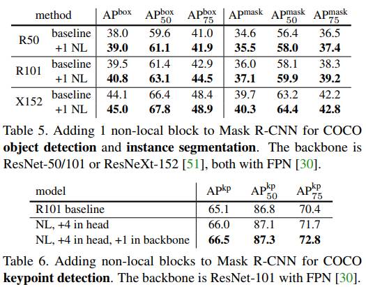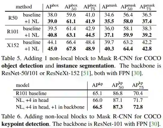 最后,下面这张图展示了将非局部模块与 Mask R-CNN 结合后,在 COCO 物体检测、实例分割以及人体关键点检测任务中性能均有所提升,使用了50和100层的ResNet,以及152层的ResNeXt。