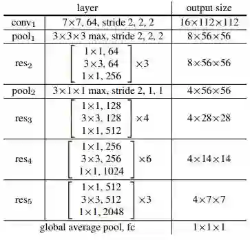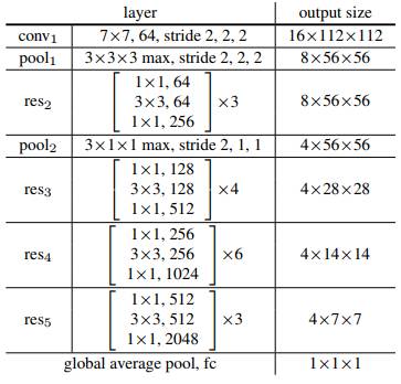 视频的基线模型是 ResNet-50 C2D。三维输出映射和滤波核的尺寸用T×H×W 表示(二维核则为 H×W),后面的数字代表通道数。输入是32×224×224。方括号里的是残差模块。