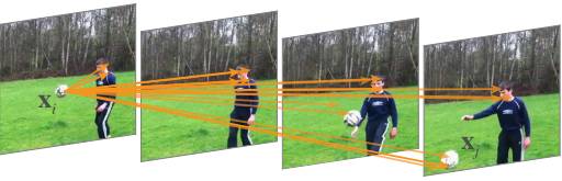 | 摘要 卷积和递归运算都是一次处理一个局部邻域的基本计算组件(building block)。在本文中,我们将非局部运算(non-local operation)作为获取长时记忆(long-range dependency)的一类通用组件。受计算机视觉中的经典非局部均值方法的启发,我们的非局部运算将一处位置的响应计算为所有位置的特征的加权和。这个组件可以插入到许多计算机视觉结构中。在视频分类任务上,即使没有任何花里胡哨的处理,我们的非局部模型也能在 Kinetics 和 Charades 数据集上获得与一些当前视觉竞赛的冠军模型相当乃至更好的效果。在静态图像识别中,我们的非局部模型提高了 COCO 物体检测/分割和人体姿态估计这些任务的性能。代码今后公开。 作者训练好用于视频分类的一个网络,在时空上进行非局部运算的示例。计算时,位置 Xi 的响应等于时空中所有位置的特征的加权和。注意第一帧里球的位置与后两帧球的关联。来源:论文(下同) 论文中给出的深度神经网络非局部计算公式,其中 i 是(空间、时间或时空上的)输出位置的序号,计算的就是位置 i 的响应,j 是所有可能位置的序号。x 是输入信号(一般是特征,可以是图像数据、序列数据或视频数据),y 是与 x 相同大小的输出信号。函数 f 计算 i 和所有 j 之间的标量(代表两者间的关系)。一元函数 g 计算位置 j 处的输入信号的表征。最终响应通过因子C(x)归一化。 |