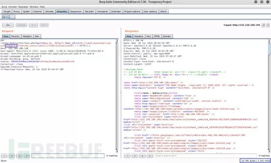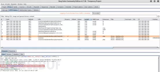 设置Mozilla Firefox浏览器代理为127.0.0.1:8080,用于指向BurpSuite,然后在浏览器中访问漏洞URL,再通过BurpSuite中的HTTP history找到Cookie的详细信息,如下图所示: