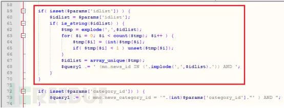 修复后的代码与之前的问题代码相比较,主要有三处改动:一、在将变量idlist的值分解为数组赋值给变量tmp之后,idlist被置为空;二、新增变量val,用于将强制类型转换后的数据传递给idlist;改变if语句判断条件和操作,防止发生count($tmp)-1和重复字符的操作。