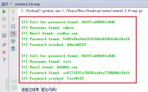 2. 通过命令main()来调用main函数,运行该SQL盲注漏洞利用程序,结果如下:可以看到获取到了全部用户的salt值、用户名、Email以及密码密文和明文,与MySQL数据库中记录的内容完全一致,数据库信息详见下图: