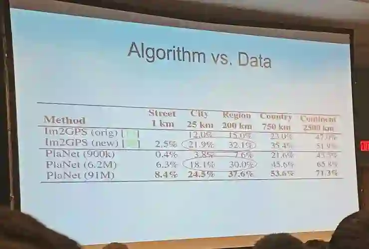 另一个例子是他自己在 2008 年用最近邻算法做了图像的地理位置识别,巧的是谷歌也在 2016 年用深度学习研究了同一个问题。作为后来者的谷歌拿出了更多的数据,所以结果更好。