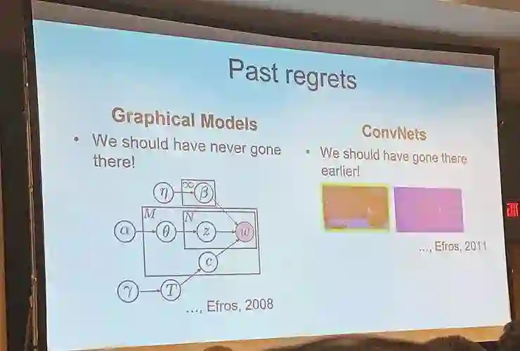 Alexei Efros 说自己的学术生涯里有两大遗憾:图模型,就不应该尝试这个方向的,而且把很多别的研究人员也带到沟里了;而卷积网络,应该更早地研究、更早地使用。他讲了一则趣事,Yann LeCun 以前到伯克利做过演讲,介绍 CNN,LeCun 讲的时候仿佛完全没觉得有必要解释是怎么来的,就只是说了你需要这个、那个,把它们连起来,然后就好了。他还带了电脑,现场演示训练和预测(当时别的方法都没法这么快地完成)。这和当时做图模型的人的做法完全不一样,但也直到后来大家才接受了 CNN。