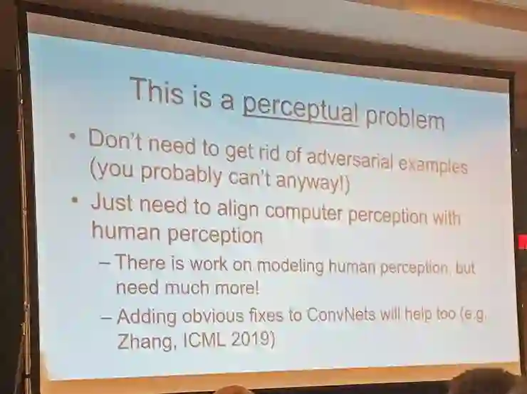 1,对抗性攻击和鲁棒性问题,他认为这不应该是个问题,没必要花那么多精力去想办法避免,实际上可能也永远都避免不了。因为对抗性样本本来就不是来自自然数据流形的数据,落在由自然数据流形所划分的决策边界上就是有可能的,所以这并不是一个数学问题,而是一个人类的感知问题。他的建议是只要我们让人类的视觉行为和计算机的类似就行了。换句话说,对抗性样本只是人类与计算机的感知特点不同的表现,而不是问题本身;如果想要治病,不要只吃止痛药(要研究感知特点,就不要紧盯着想要消灭对抗性样本);
