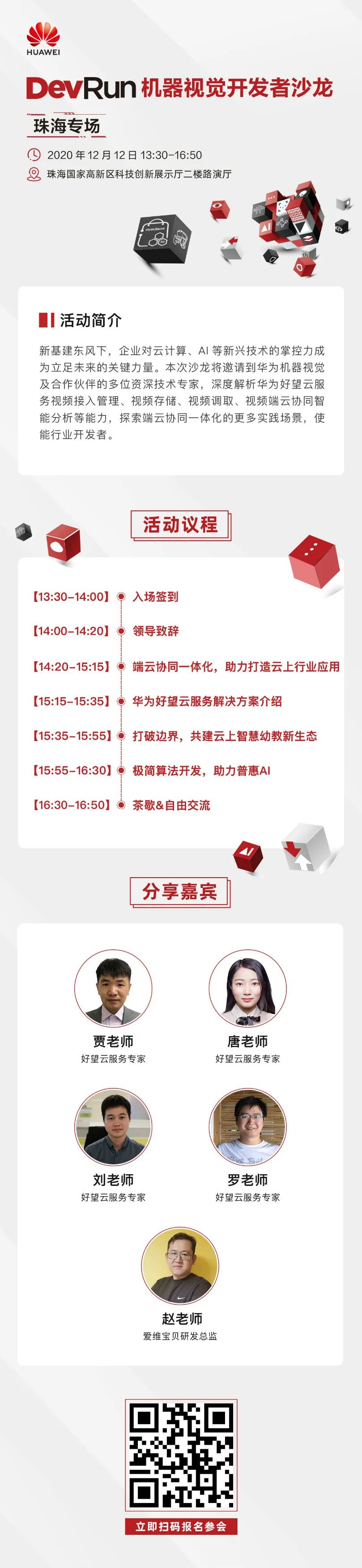 为了帮助企业与开发人员更好地了解华为好望云服务的设计理念、技术特性和业务价值,展现智能视觉为企业开拓的精彩未来,2020 年 12 月 12 日,在珠海国家高新技术产业开发区管委会的大力支持下,华为 DevRun 机器视觉开发者沙龙将在珠海市高新区举办。