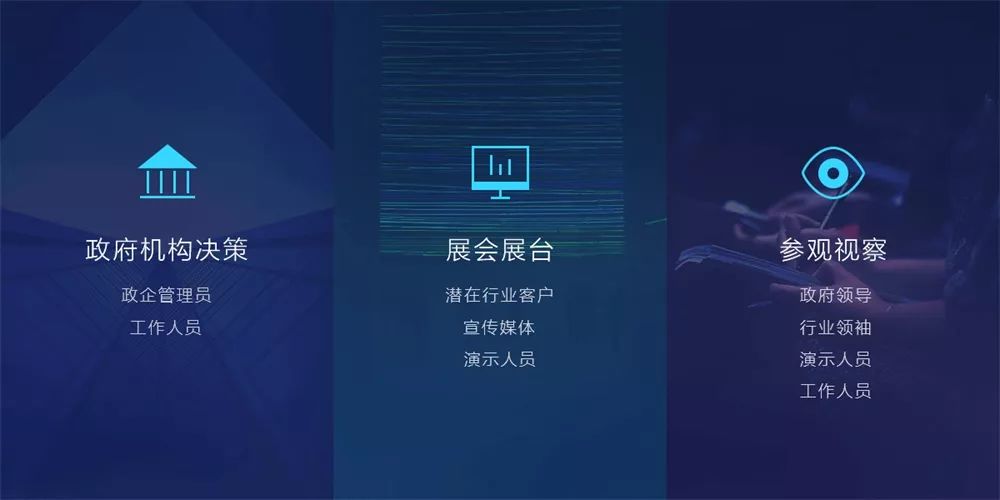 基于以上的市场潜在规模的考察和典型客户研究,在进行「灵鲲」产品能力规划时,我们主要考虑以下三类使用场景: 政府机构决策、展会展台及参观视察。