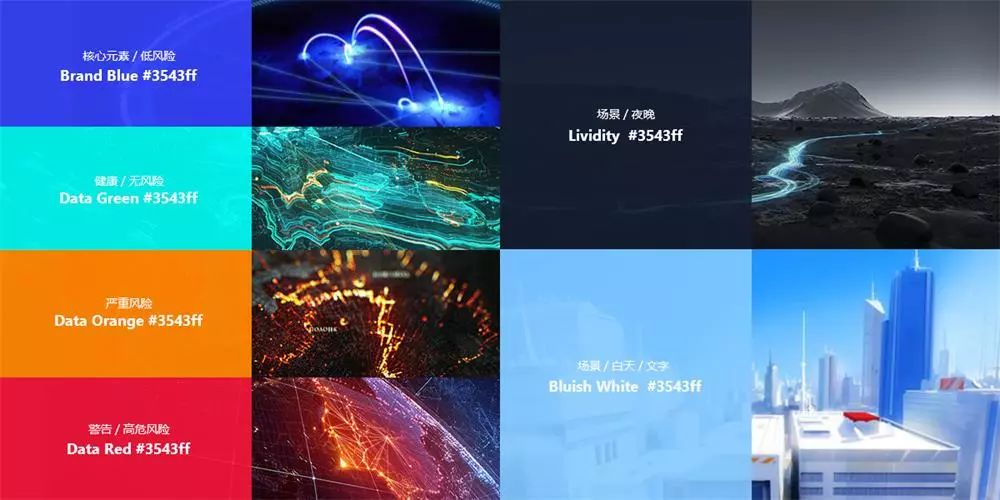 灵鲲金融态势感知系统内容架构分为数据维度和场景维度,数据是核心,场景是大数据呈现的承载体;场景使用具有金属质感的深青灰,符合理性的、冷静的、智能化产品的个性;数据色彩使用透明、发光、具有未来感的高亮色,和场景形成强对比,使数据更为突显、更具吸引力;为了强化客户对于风险的感知,通过颜色区分数据的风险等级,更直观的传达数据的含义。如:高风险的使用红色,红色让人联想到危险、警报。
