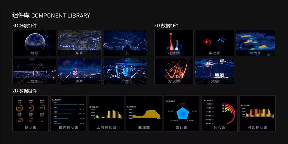为了提升产品搭建的效率,降低了研发周期和成本,产品功能模块实现了组件化,分为3D场景组件、3D数据组件、2D数据组件。任何一位设计师都可以根据产品需求,搭配组件模块,快速搭建大数据可视化产品。