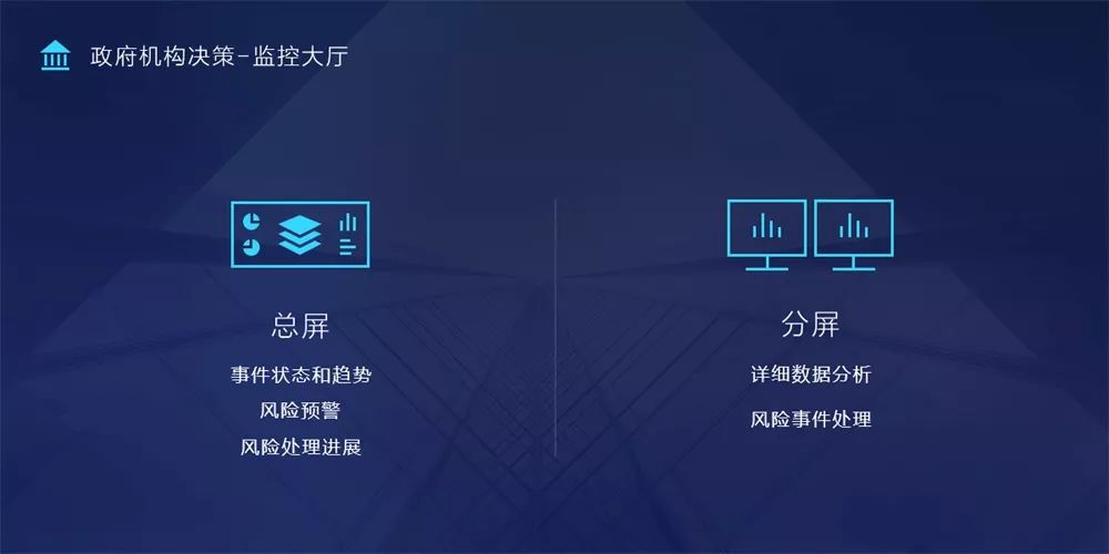 在金融局等相关政府机构的日常工作中,决策层和相关工作人员会基于实时金融平台数据,针对日常事务或紧急事件进行决策管理,监控大厅也就应运而生。基于这种工作方式,我们可以发现潘洛斯的产品特性非常契合监控大厅的使用场景。在监控大厅中,用户是通过两种不同的信息界面进行工作的,分别是综合数据可视化大屏(总屏)以及工作人员独立使用的电脑屏幕(分屏)。其中,在总屏上,呈现的内容通常是一些对于决策者来说至关重要的信息:正在发生的事件的状态和可能趋势(发生了什么)、值得注意的风险(需要团队做什么)以及风险的处理进度(团队做的怎么样);而在分屏上,主要为工作人员提供数据分析及风险事件处理功能,帮助团队对事件迅速作出响应,高效协作。
