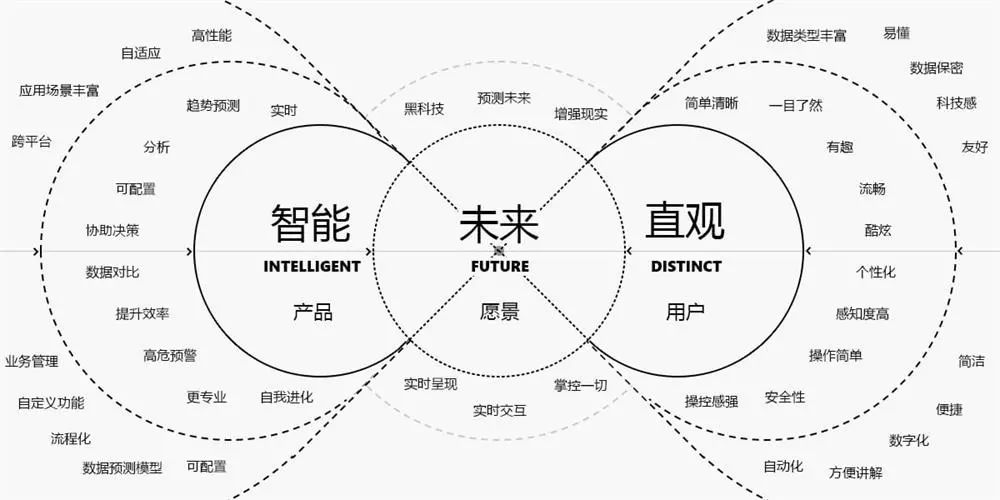 为了打造灵鲲产品的可视化,在竞品中脱颖而出,我们从产品功能、用户、愿景三个维度发散,提炼出设计指南的关键词:智能、直观、未来,塑造独特的大数据可视化风格体系。