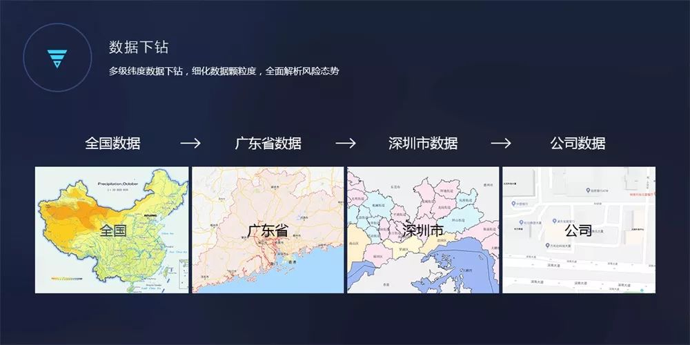 具体来讲,全国的安全风险最终是以加权平均后的指数形式体现出来;再到具体的省份和城市,内容细化到具体风险事件的发生情况,如电信安全监管维度,呈现电信诈骗使用的伪基站的位置,以及发送诈骗短信的数量等;最后细化到城市中的机构和建筑,呈现具体机构的运行情况和具体高风险企业所在建筑进行实时监控。