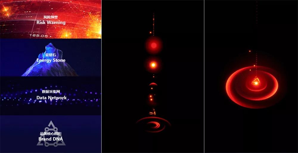 灵鲲的3D数据样式有柱状图和散点图。如何把司空见惯的数据样式,设计出产品的个性,是我们重点要解决的问题。为了体现大数据的力量感,使用科幻电影中的聚合能量、发光的能量石作为柱状图的主图形;同时把数据采集、融合、分析的过程具象为动态粒子网络,作为辅助图形。数据图形和结构中都融合了品牌 DNA 的三角图形,数据样式更具有品牌的个性。
