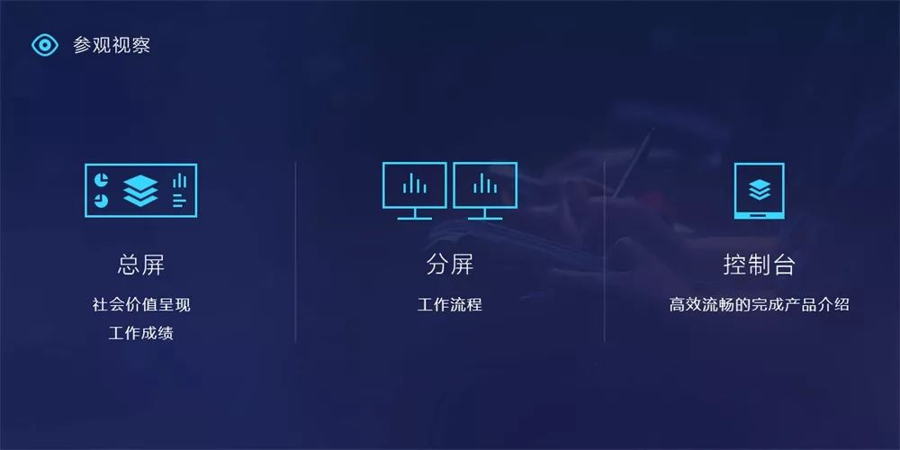 不同于工作场景,灵鲲产品在展会中展台的主要受众是参会人士,除了一般民众外,更有价值的观众主要来自于媒体和潜在客户等。所以在这个场景中展示的内容与实际工作中的数据可视化内容有一定的区别,更多的是对产品能力的展示、产品的宣传以及社会价值的呈现。如何直观的呈现产品的能力,并使观众快速获得有价值的信息并留下深刻印象非常重要。这也决定了在这个场景中,用户不仅包括观众,也包括演讲者。我们需要考虑如何通过控制端让讲演者高效而流畅的完成产品介绍。