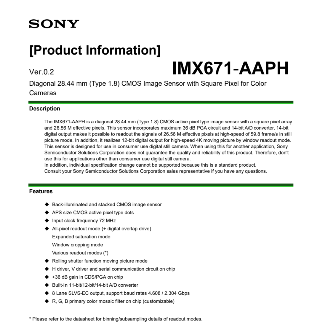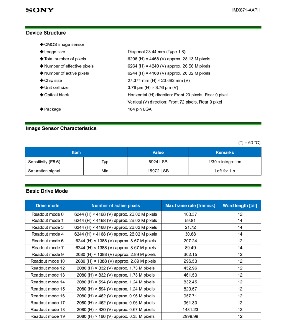 IMX671-AAPH 是一块 APS-C 画幅的堆栈式 CMOS 图像传感器,对角线长度为 28.44mm,总像素为 6296*4468(28.13MP),有效像素为 26.56MP,活跃像素为 26.02MP,ADC 精度最高为 14bit,还提供 11bit、12bit 不同工作模式。