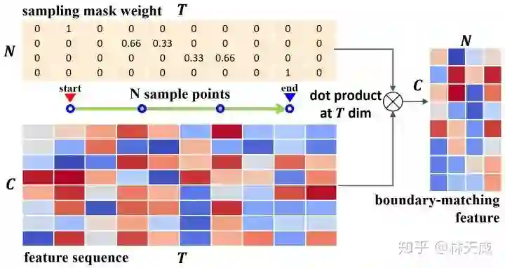 。因此,通过矩阵点乘的方式,我们可以非常高效地同时给所有时序提名生成准确对应的特征表示。此外,直接从特征序列中采样得到的提名特征表示比起从一维概率序列中采样得到的概率序列具有更丰富的语义信息。
