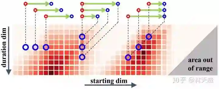 首先介绍一下什么是BM置信度图。此处,我们将一个时序提名定义为一个开始边界和一个结束边界所构成的边界匹配对。然后我们按照时序提名开始边界的位置以及时序提名的长度将所有可能存在的时序提名结合成一个二维的边界匹配图。如下图所示,在这个图上的每一列上的时序提名具有相同的开始时间,而每一行上的时序提名具有相同的时序长度。此外,由于右下角这个三角形区域中的时序提名的结束时间超出了视频的范围,因此在训练和测试时不被纳入考虑。
