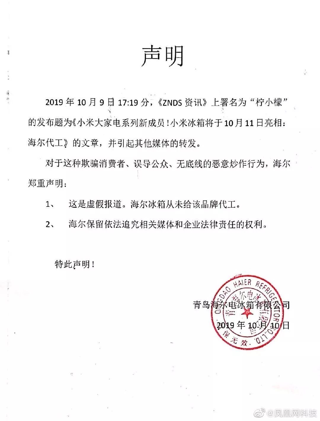 10 月 10 日消息,针对有媒体刊文称即将发布的小米冰箱由海尔代工一事,海尔官方发表声明,表示海尔冰箱从未给小米代工,此为虚假报道。海尔保留依法追究相关媒体和企业法律责任的权利。