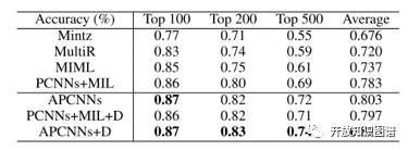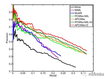 文章在远程监督常用的数据集(Rediel 2010)上,按照常规的远程监督的实验思路,分别进行了 heldout 和 manual 实验。Heldout 实验即使用知识库中已有的关系实例标注测试集,验证模型的性能,结果如下面的 Precision-Recall 图所示,超过其他最好的方法。