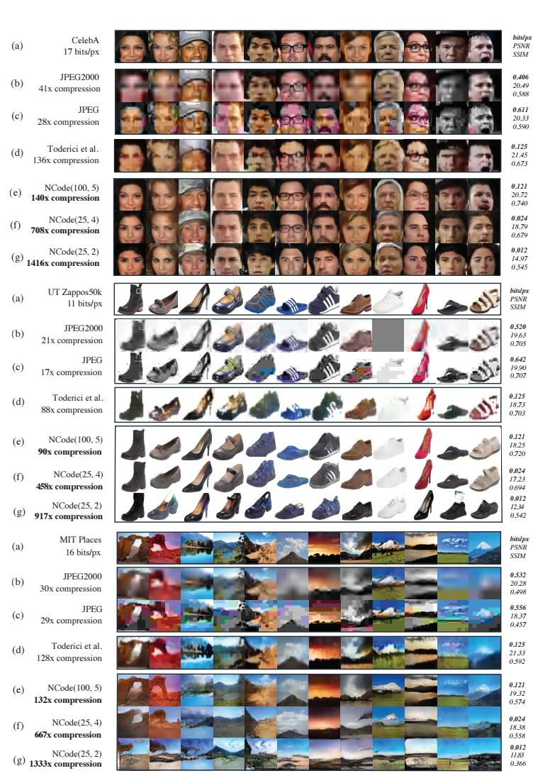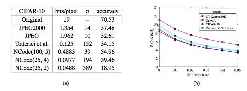 图 4:(a) 压缩图像真实可信度的验证 (η=压缩因子),NCode 与 JPEG、JPEG2000、Toderici et al[6] 方法进行对比,使用在未压缩图像上单独训练的卷积网络将每个样本分类到相应的 CIFAR-10 数据集类别中。(b) 每个 NCode 图像数据集上重建图像质量的损失(PSNR)用比特误码率函数 ε 表示。JPEG PSNR 在 ε ∼ 10−4 上的损失大约超过 7dB。