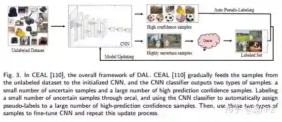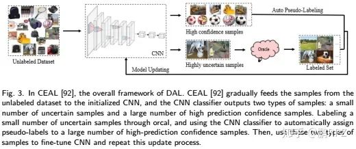 为了解决这个问题,CEAL为具有高置信度的样本分配伪标签,并将其添加到使用基于不确定性的AL方法查询到的高度不确定性的样本集中,使用扩充后的训练集一起训练DAL模型图像分类器。