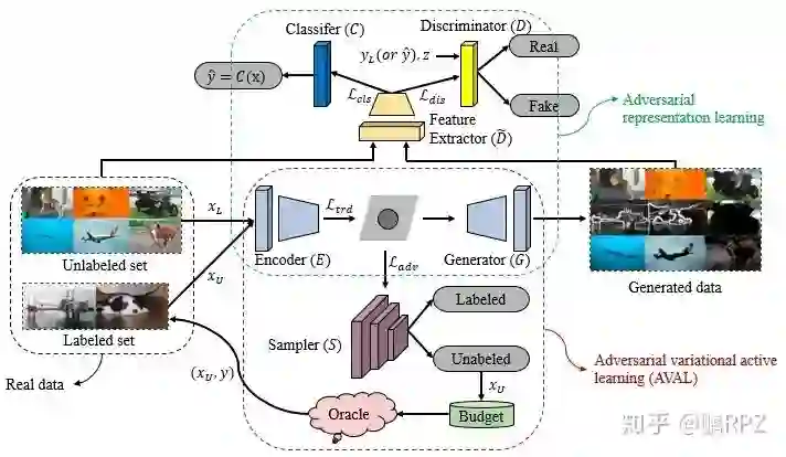 具体的,VAAL注意到基于不确定性的batch查询策略除了容易导致样本多样性不足的问题,实际上还非常容易受到异常值的干扰。此外,对于高维数据基于密度的方法容易受到p-范数的限制,导致计算的距离过于集中。为此,VAAL提出使用对抗学习表示的方法来区分标记数据与未标记数据的潜在空间的编码特征,从而削弱异常值的干扰。并且VAAL使用标记数据和未标记数据以半监督的方式来共同训练 variational autoencoder (VAE) 试图欺骗对抗网络预测所有的数据点均来自标记池,以此来解决距离集中的问题。VAAL在大规模的数据集上可以学习有效的低维潜在表示,并通过共同学习表示形式和不确定性提供了一种有效的主动学习采样方法。