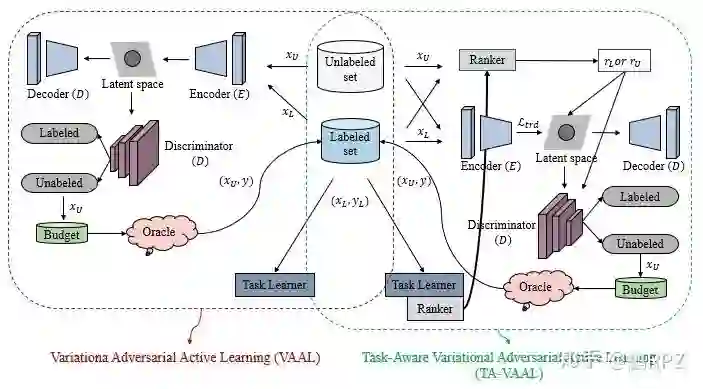 TA-VAAL(2020)也探索这种混合查询策略的平衡。TA-VAAL认为基于不确定性的方法没有很好的利用整体的数据分布,而基于数据分布的方法往往忽视了任务中的结构。因此,TA-VAAL提出将损失预测模块和RankCGAN概念整合到变分对抗主动学习(VAAL)中,以便同时考虑数据分布和模型的不确定性。TA-VAAL在各种平衡和不平衡的基准数据集上都取得了很好的性能。TA-VAAL与VAAL的结构图被展示在fig6.