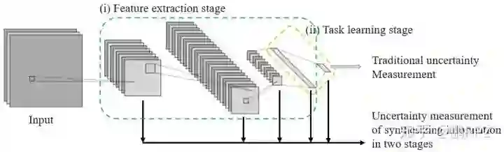 以常见的CNN为例,展示了传统不确定性测量方法与综合两个阶段(即,特征提取阶段与任务学习阶段)信息的不确定性测量方法的对比。