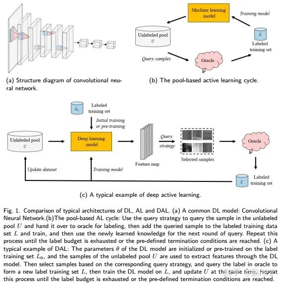 在本节中,我们将对DAL的相关工作进行全面系统的概述。Fig.1c显示了一个典型的深度主动学习的模型架构示例。深度主动学习的典型例子: 深度学习model的参数 在初始化标签训练集 上进行初始化或者预训练,无标记池 的样本通过深度学习model提取特征。然后基于相应的查询策略挑选样本,并在oracle中查询标签,形成新的标签训练集 ,接着在 上训练深度学习model,同时更新 。重复这个过程,直到标注预算被耗尽或者达到预先设定的终止条件。从Fig.1c中的DAL框架示例中我们可以粗略的将DAL的框架分成两大部分:在未标注数据集上的主动学习查询策略以及deep learning model的训练方法。为此,我们将在接下来的3.1和3.2中分别对他们进行讨论和总结。最后,我们将在3.3中讨论deep active learning 在模型的泛化通用性上所做的努力。