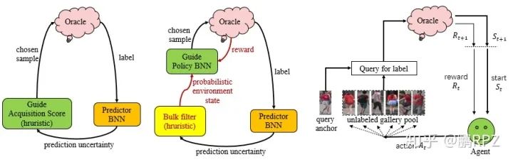 标准的AL,RAL and DRAL的管道对比。(a)标准的AL管道通常由三个部分组成。Oracle提供一组标记数据,预测器(此处为BNN)用来学习这些数据,并为指南提供了可预测的不确定性,该指南通常是固定的,硬编码的获取函数,它为Oracle挑选下一个样本从而重新开始循环。(b)RAL用策略BNN代替固定获取函数,该策略BNN以概率状态进行学习,并从oracle获得反馈,以强化学习的方式学习如何选择下一个最优的样本点(红色的新部分)。因此,RAL可以更加灵活地调整获取函数以适应现有的数据集。(c)DRAL为person Re-ID任务设计了一个深度强化主动学习框架。对于每个查询锚点(探针),代理(增强型主动学习者)将在主动学习过程中从图库池中选择实例交给oracle以获得带有二进制反馈(正/负)的人工注释。状态评估所有实例之间的相似关系,根据oracle的反馈计算奖励从而调整代理的查询。
