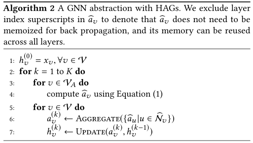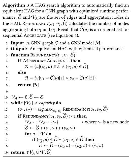 使用了HAG的GNN和传统GNN的唯一区别在于如何计算每一个GNN的领域聚合的过程(即 ),在聚合过程中,该文章增加了一个步骤用来存储常用的中间聚合的结果,用以减少冗余的计算,即为algorithm1的第3~4行。